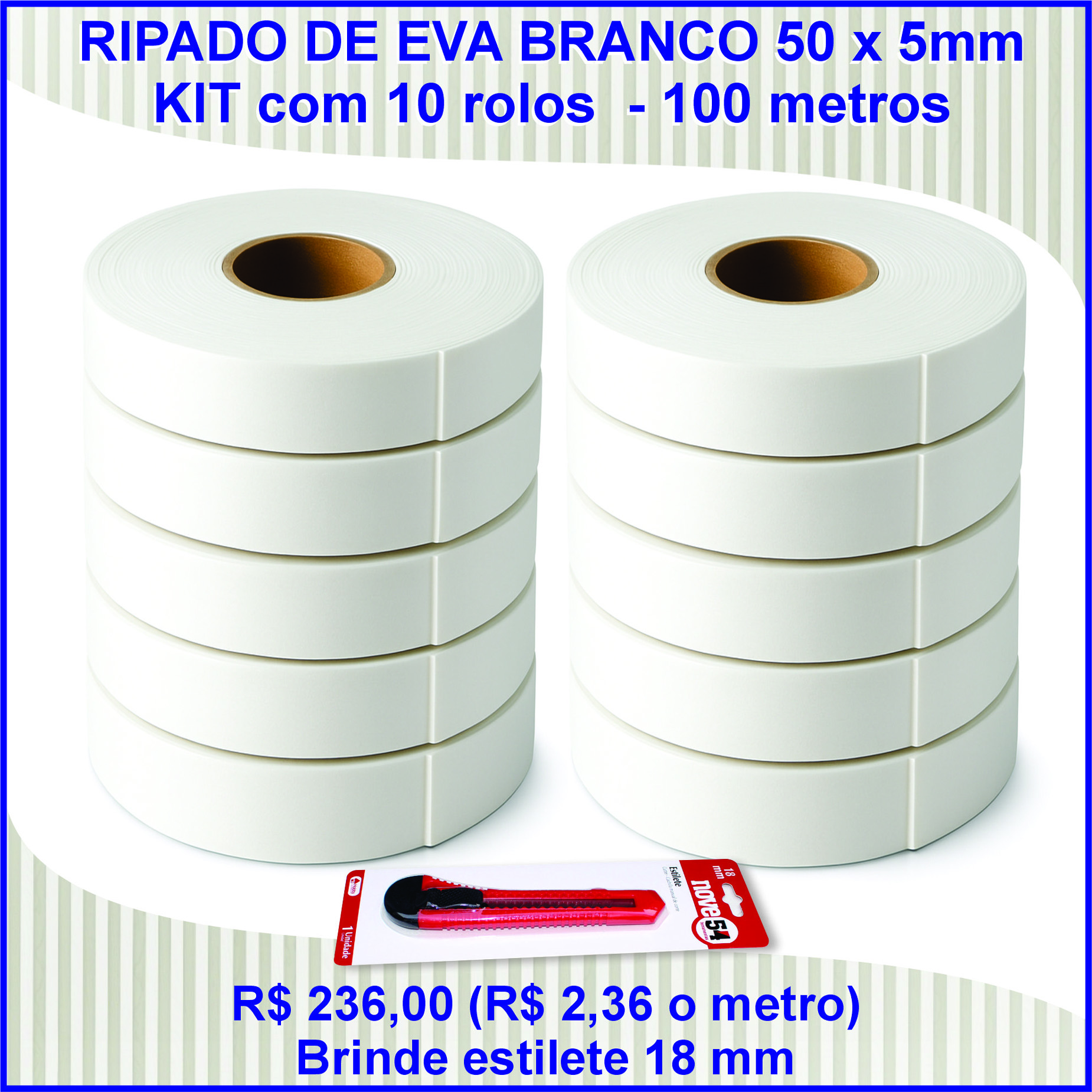 KIT Ripado EVA Branco Autoadesivo 10 Rolos - 5mm x 50mm x 100 metros